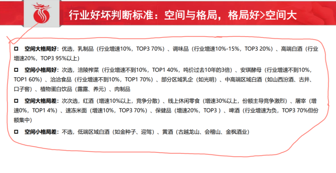 这张图展示了各个细分行业的行业空间和格局,该券商认为行业的好坏标准是:格局好才是真的好。