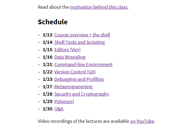 这个课程,介绍一些极为“实用”的计算机科学的知识,即如何使用一些好用(能大大提高生产力)的工具,如terminal、编辑器editor、tmux、profiler、数据处理工具(如awk, sed, grep, perl)等等。
