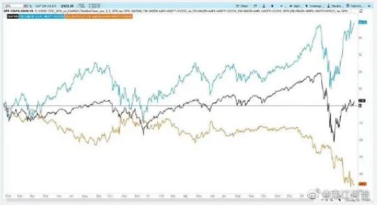 如图,蓝线是五个公司的集合指数,黑色是标普500指数,黄线是剔除五个牛股后的指数