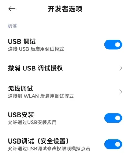 返回设置,进入开发者选项,开启“USB 调试”功能。